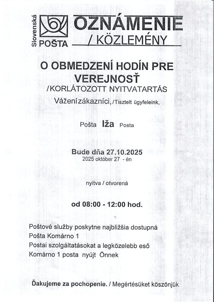 oznámenie Pošta Iža - obmedzenie hodín pre verejnosť 27.10.2025